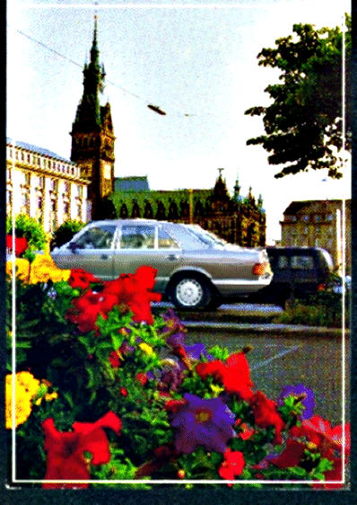 Diese Foto ist 1989 in Hamburg aufgenommen worden. Es zeigt einen W126 der eine zweistufige Verkehrsinsel erklommen hat.